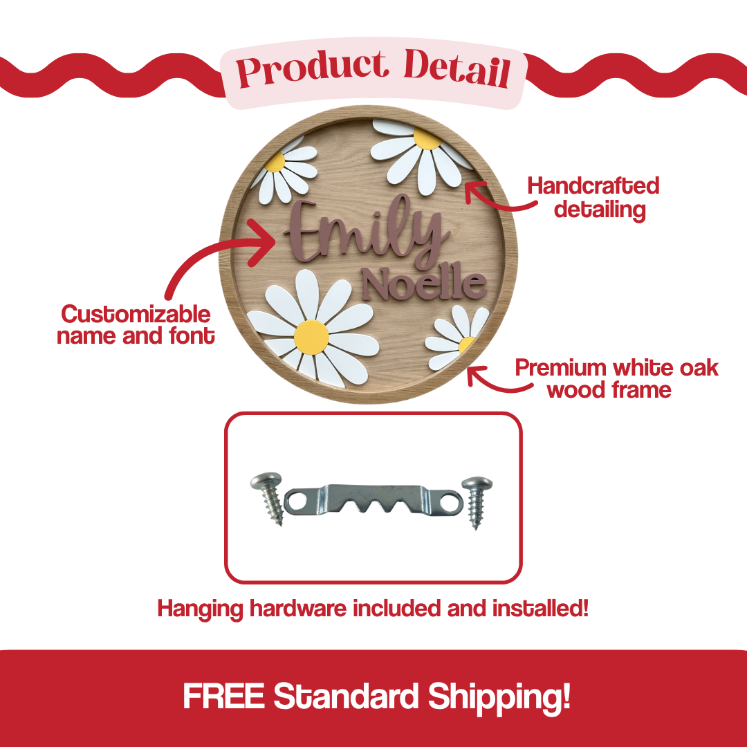Add a sweet and timeless touch to your baby girl’s room with our Daisy-Themed Custom Name Sign. Each sign is handcrafted with real wood and features layered 3D daisies and personalized lettering, creating a soft, feminine look that’s perfect for nurseries and kids’ rooms alike.